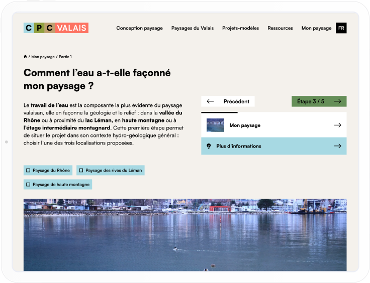 In collaboration with the Pleine Terre agency and for the Canton of Valais, we designed the website dedicated to the Cantonal Landscape Conception (CPc). This platform provides a key to understanding Valais landscapes and their challenges, through an interactive map, a resource library and a landscape assessment tool in the form of a quiz. Aimed at both territorial professionals and the general public, the site promotes the \"landscape reflex\" by integrating the landscape dimension as early as possible into projects and planning.