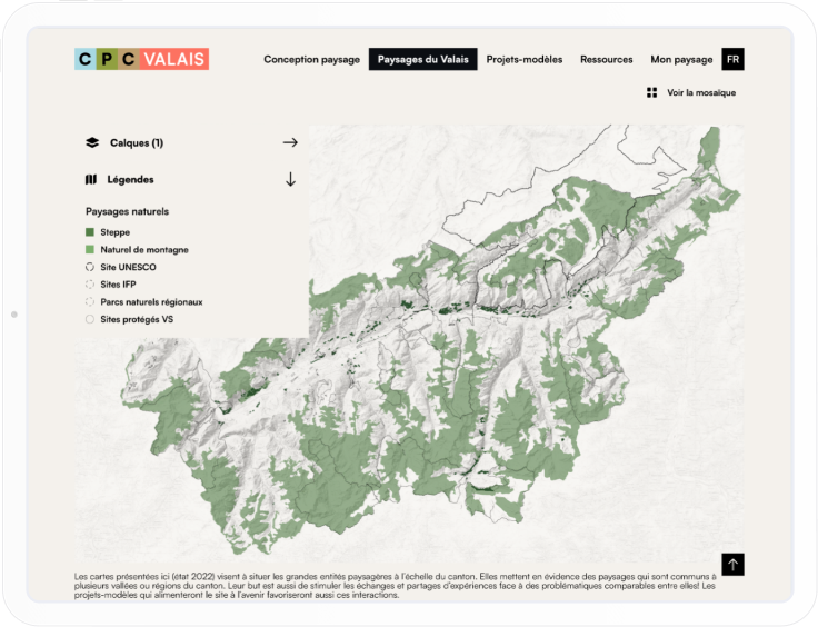 En collaboration avec l'agence Pleine Terre et pour le Canton du Valais, nous avons conçu le site dédié à la Conception Paysage cantonale (CPc). Cette plateforme offre une clé de lecture des paysages valaisans et de leurs enjeux, à travers une carte interactive, une bibliothèque de ressources et un outil d'évaluation paysagère sous forme de quiz. Destiné aux professionnels du territoire comme aux particuliers, le site favorise le « réflexe-paysage » en intégrant la dimension paysagère le plus en amont possible dans les projets et planifications.