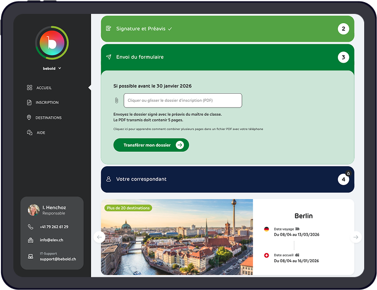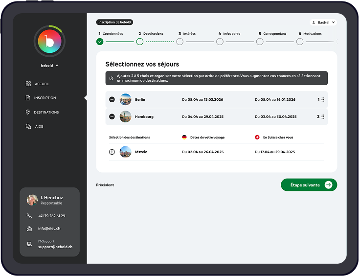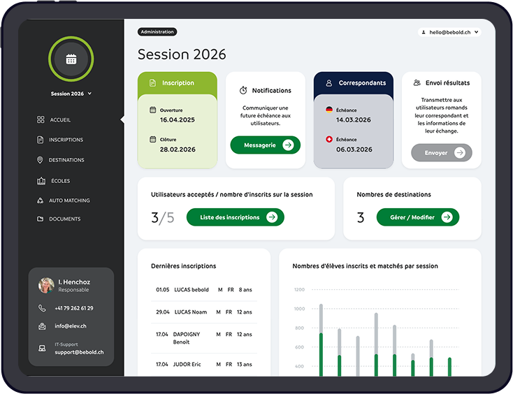 We have designed and perfected, in collaboration with the ELEV association, an application used with success in the canton of Vaud. It allows students from Switzerland, Germany, and Austria to easily register to participate in linguistic exchange programs, thanks to a fluid, efficient, and user-friendly platform.